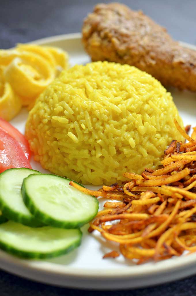 Hoofdgerecht: Nasi Kuning (gele rijst) , witte rijst,