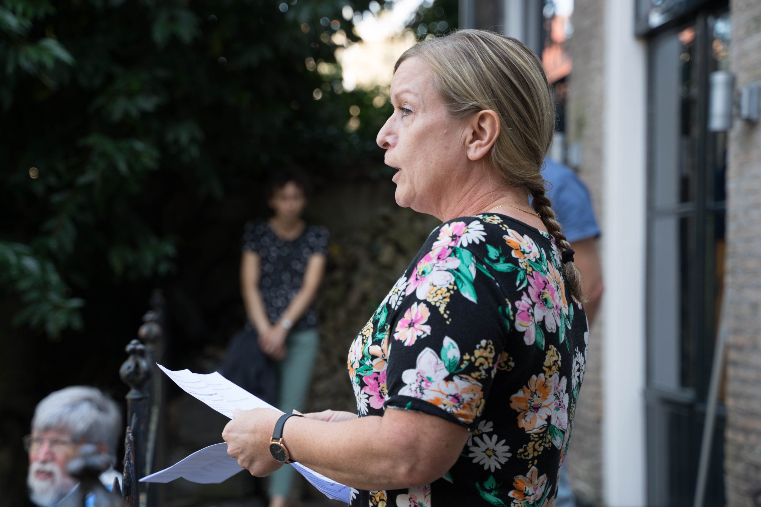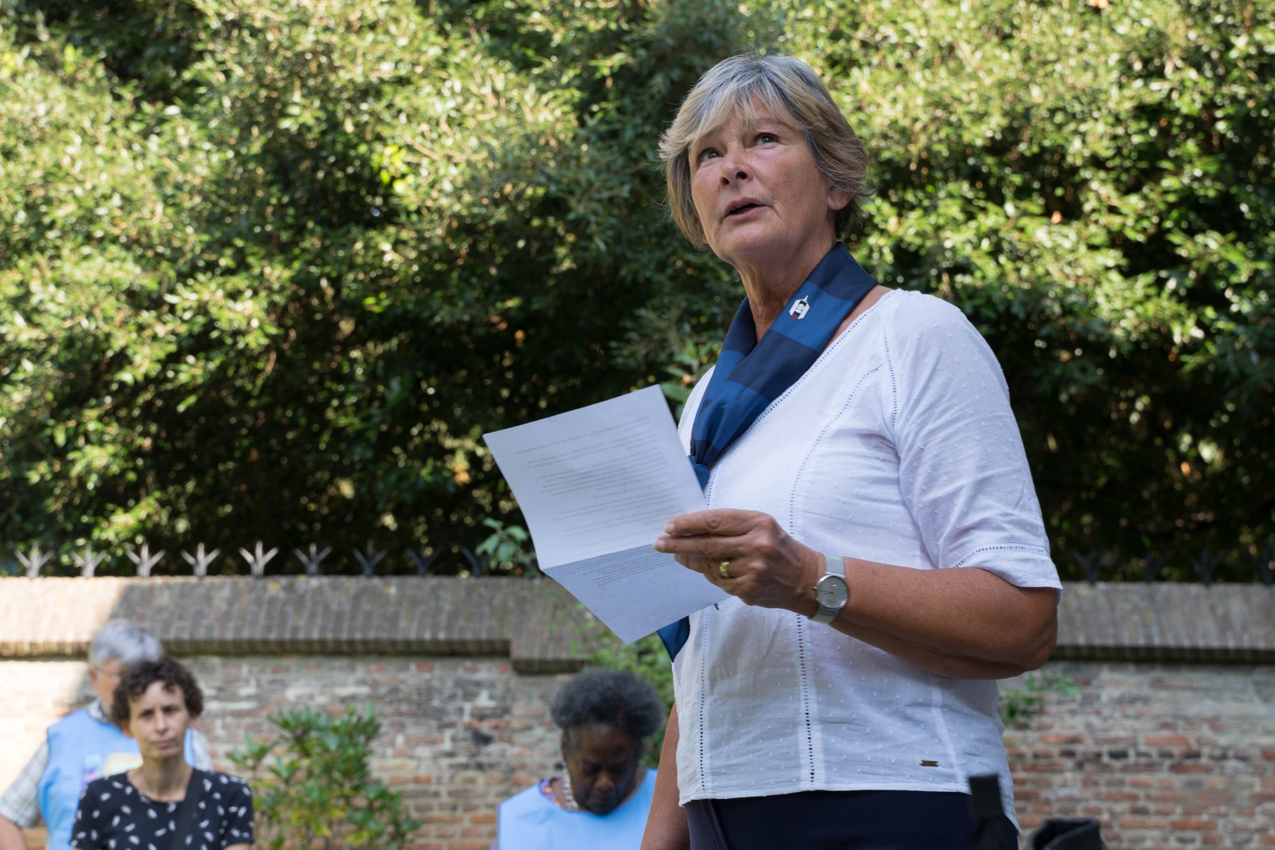 Onder aanvoering van dominee Roel Knijf en van dominee Ton van Prooien Vervolgde de wandeling naar de tuin van de Lutherse kerk aan het Stadserf. Hier sprak Carla Marcelissen over haar werk in het kamp Moira op Lesbos en hoe verschrikkelijk het was dat het kamp is afgebrand.